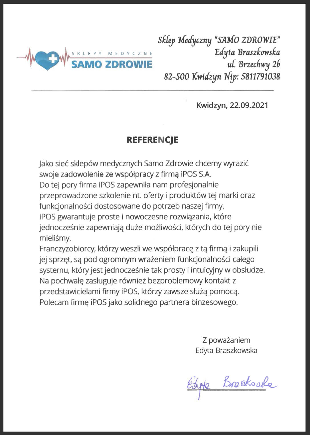 Nasza współpraca przebiega sprawnie i z dużym zaangażowaniem, dlatego z całym przekonaniem rekomendujemy firmę iPOS S.A. jako specjalistę w branży fiskalno - płatniczej oraz rzetelnego i godnego zaufania partnera biznesowego.