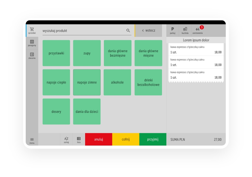Dedykowany głównie gastronomii oraz biznesom, które ze względu na dużą ilość asortymentu potrzebują bardziej zaawansowanej kategoryzacji. W tym widoku powiększone zostało pole robocze - zniknęła kolumna z kategoriami, które pojawiły się w nieco innej, łatwiejszej do obsługi odsłonie.